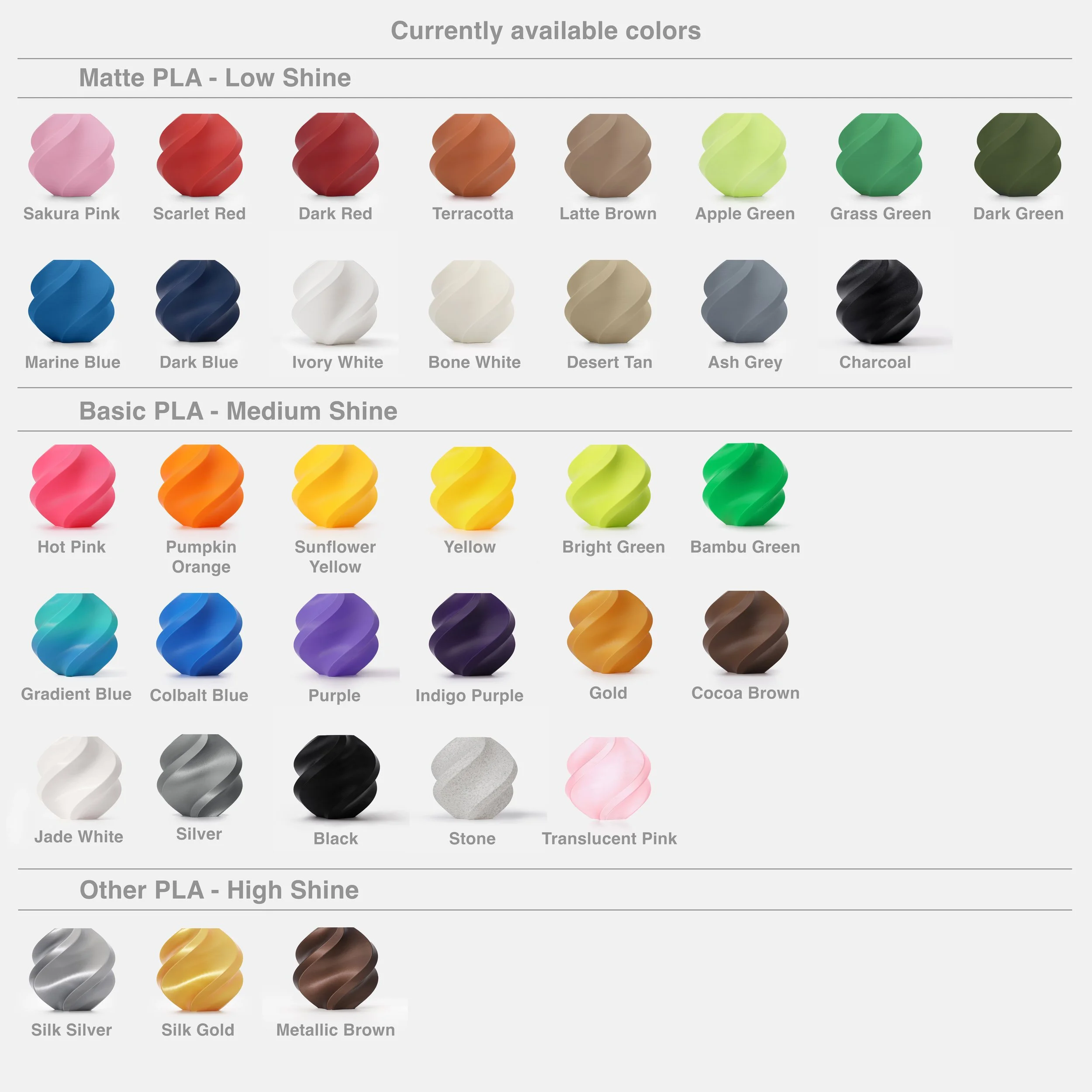 All products listed are 3D printed and made of